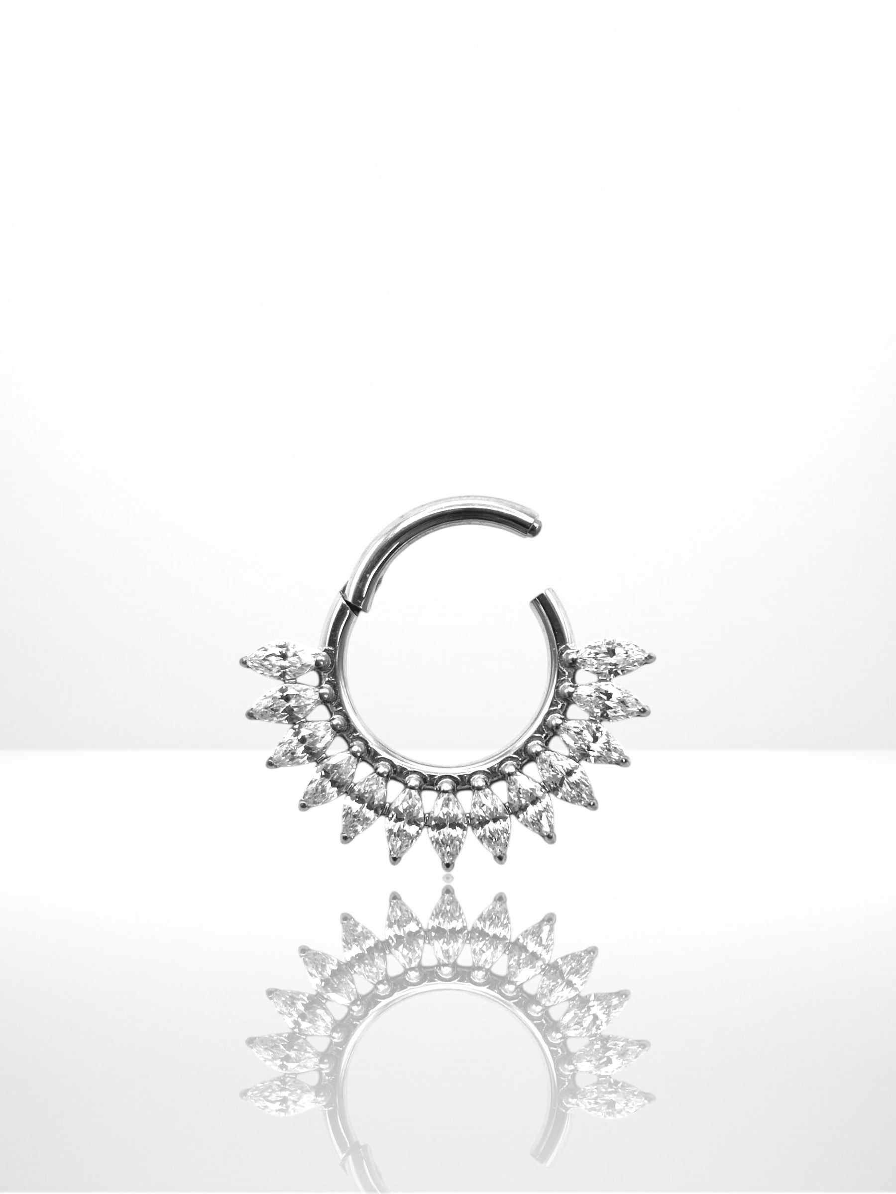 Elegantný a odolný krúžok z kvalitného titánu, zdobený zástupom žiarivých zirkónov v tvare listu.